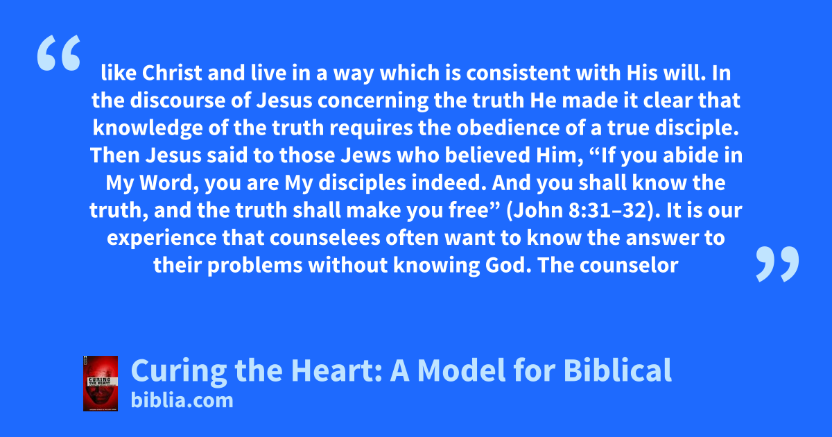 like Christ and live in a way which is consistent with His will. In the discourse of Jesus concerning the truth He made it clear that knowledge of the truth requires the obedience of a true disciple. Then Jesus said to those Jews who believed Him, “If you abide in My Word, you are My disciples indeed. And you shall know the truth, and the truth shall make you free” (John 8:31–32). It is our experience that counselees often want to know the answer to their problems without knowing God. The counselor