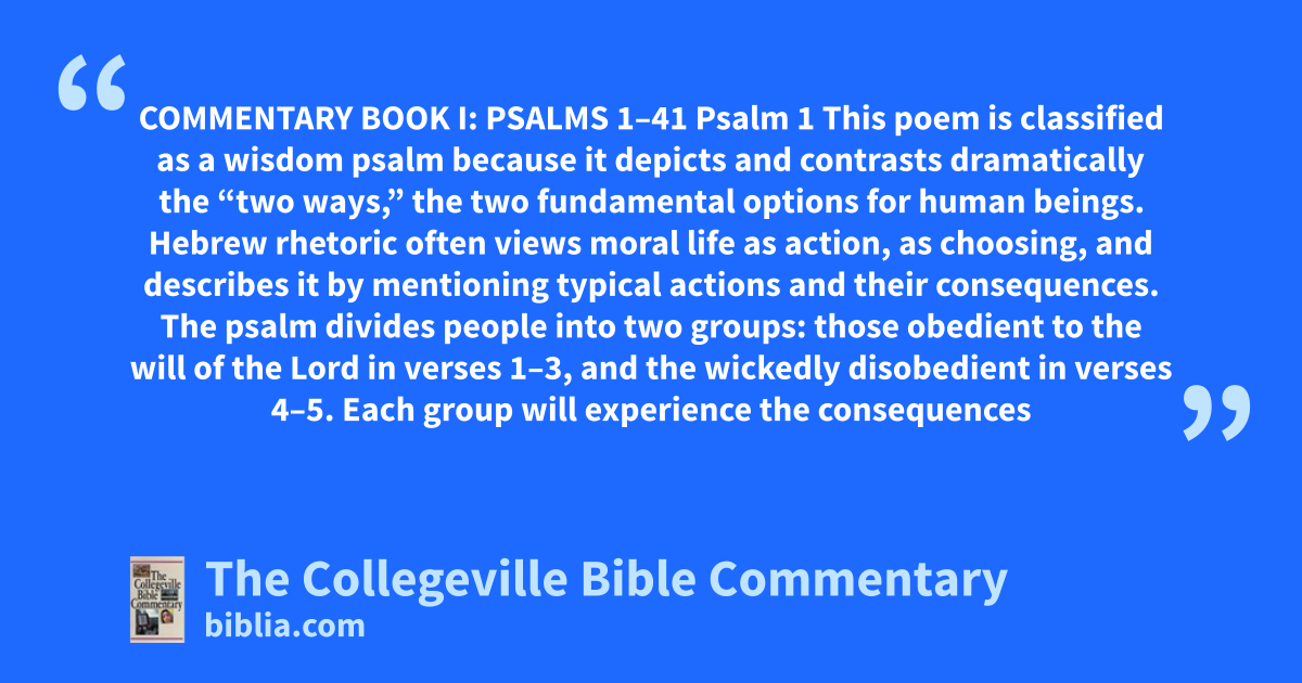 COMMENTARY BOOK I: PSALMS 1–41 Psalm 1 This poem is classified as a wisdom psalm because it depicts and contrasts dramatically the “two ways,” the two fundamental options for human beings. Hebrew rhetoric often views moral life as action, as choosing, and describes it by mentioning typical actions and their consequences. The psalm divides people into two groups: those obedient to the will of the Lord in verses 1–3, and the wickedly disobedient in verses 4–5. Each group will experience the consequences