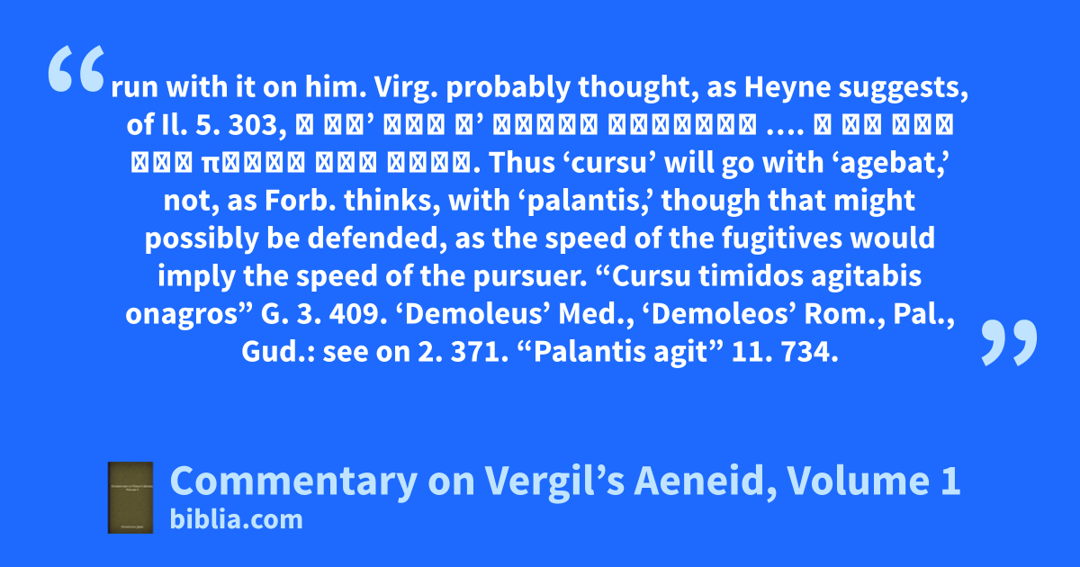 run with it on him. Virg. probably thought, as Heyne suggests, of Il. 5. 303, ὃ ουʼ δύο γʼ ἄνδρε φέροιεν …. ὁ δέ μιν ῥέα πάλλε καὶ οἶος. Thus ‘cursu’ will go with ‘agebat,’ not, as Forb. thinks, with ‘palantis,’ though that might possibly be defended, as the speed of the fugitives would imply the speed of the pursuer. “Cursu timidos agitabis onagros” G. 3. 409. ‘Demoleus’ Med., ‘Demoleos’ Rom., Pal., Gud.: see on 2. 371. “Palantis agit” 11. 734.
