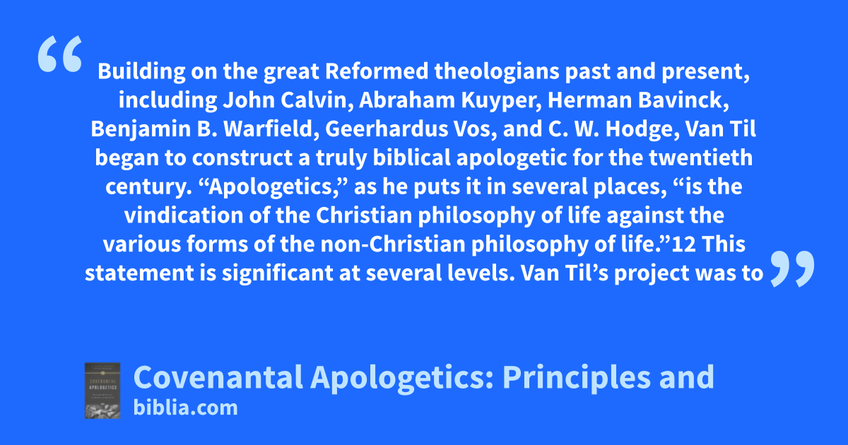 Building on the great Reformed theologians past and present, including John Calvin, Abraham Kuyper, Herman Bavinck, Benjamin B. Warfield, Geerhardus Vos, and C. W. Hodge, Van Til began to construct a truly biblical apologetic for the twentieth century. “Apologetics,” as he puts it in several places, “is the vindication of the Christian philosophy of life against the various forms of the non-Christian philosophy of life.”12 This statement is significant at several levels. Van Til’s project was to