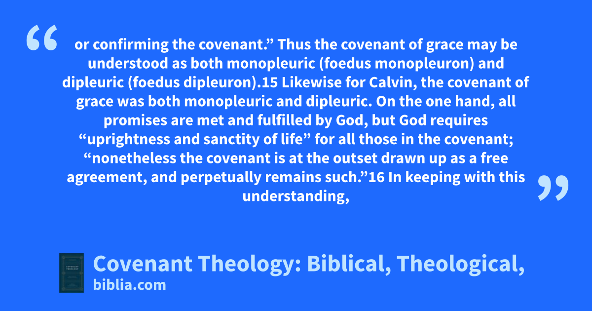 or confirming the covenant.” Thus the covenant of grace may be understood as both monopleuric (foedus monopleuron) and dipleuric (foedus dipleuron).15 Likewise for Calvin, the covenant of grace was both monopleuric and dipleuric. On the one hand, all promises are met and fulfilled by God, but God requires “uprightness and sanctity of life” for all those in the covenant; “nonetheless the covenant is at the outset drawn up as a free agreement, and perpetually remains such.”16 In keeping with this understanding,