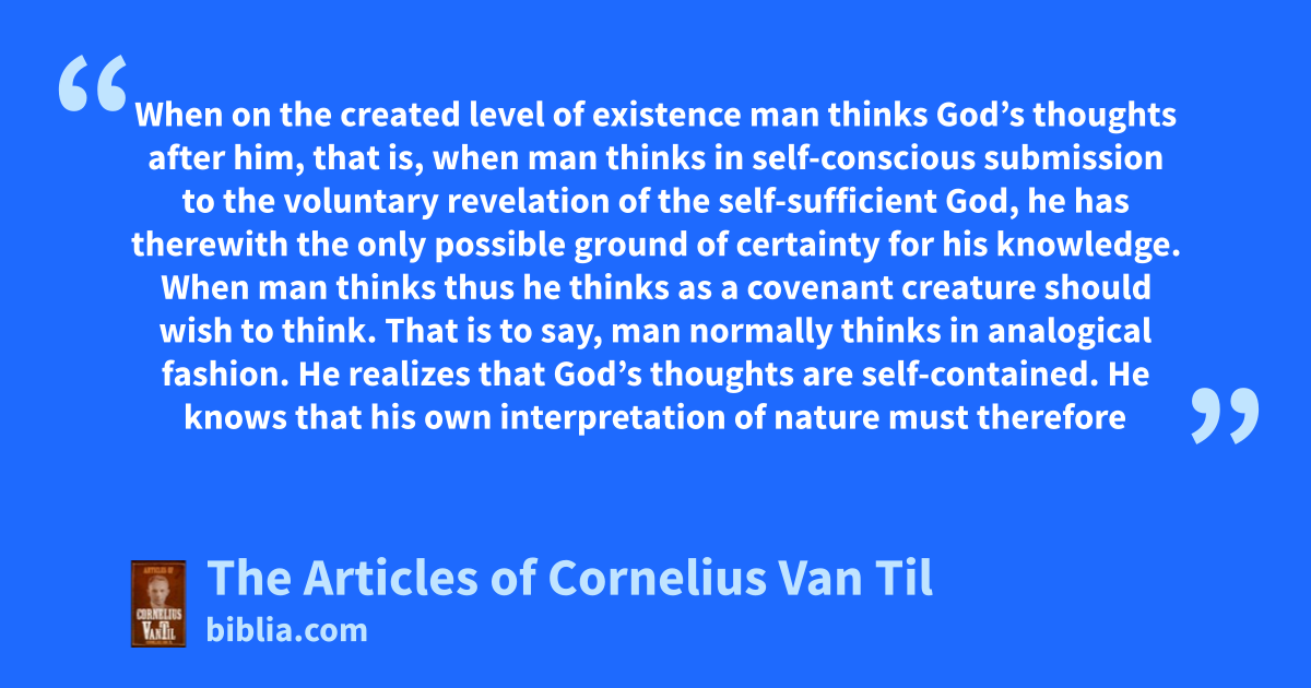 When on the created level of existence man thinks God’s thoughts after him, that is, when man thinks in self-conscious submission to the voluntary revelation of the self-sufficient God, he has therewith the only possible ground of certainty for his knowledge. When man thinks thus he thinks as a covenant creature should wish to think. That is to say, man normally thinks in analogical fashion. He realizes that God’s thoughts are self-contained. He knows that his own interpretation of nature must therefore