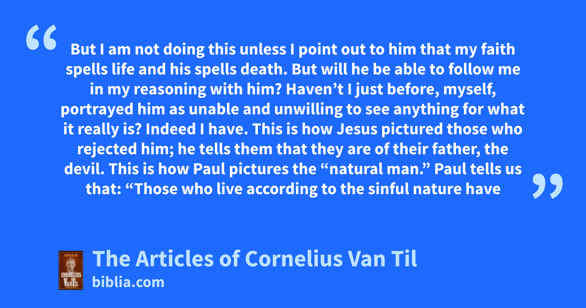 But I am not doing this unless I point out to him that my faith spells life and his spells death. But will he be able to follow me in my reasoning with him? Haven’t I just before, myself, portrayed him as unable and unwilling to see anything for what it really is? Indeed I have. This is how Jesus pictured those who rejected him; he tells them that they are of their father, the devil. This is how Paul pictures the “natural man.” Paul tells us that: “Those who live according to the sinful nature have