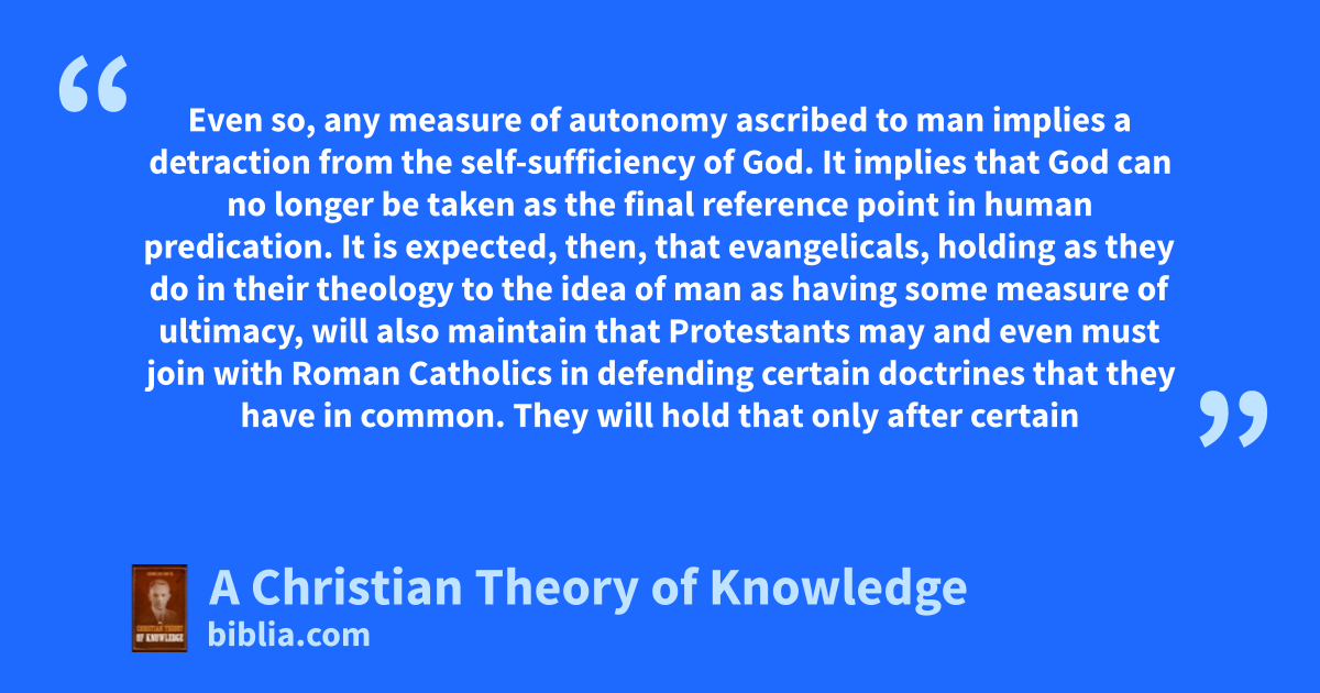 Even so, any measure of autonomy ascribed to man implies a detraction from the self-sufficiency of God. It implies that God can no longer be taken as the final reference point in human predication. It is expected, then, that evangelicals, holding as they do in their theology to the idea of man as having some measure of ultimacy, will also maintain that Protestants may and even must join with Roman Catholics in defending certain doctrines that they have in common. They will hold that only after certain