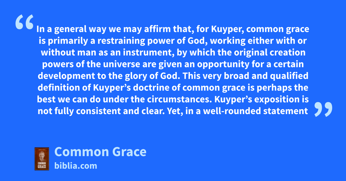 In a general way we may affirm that, for Kuyper, common grace is primarily a restraining power of God, working either with or without man as an instrument, by which the original creation powers of the universe are given an opportunity for a certain development to the glory of God. This very broad and qualified definition of Kuyper’s doctrine of common grace is perhaps the best we can do under the circumstances. Kuyper’s exposition is not fully consistent and clear. Yet, in a well-rounded statement