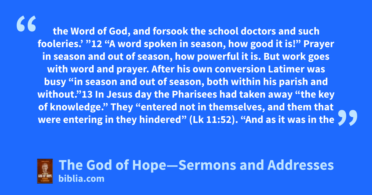 the Word of God, and forsook the school doctors and such fooleries.’ ”12 “A word spoken in season, how good it is!” Prayer in season and out of season, how powerful it is. But work goes with word and prayer. After his own conversion Latimer was busy “in season and out of season, both within his parish and without.”13 In Jesus day the Pharisees had taken away “the key of knowledge.” They “entered not in themselves, and them that were entering in they hindered” (Lk 11:52). “And as it was in the