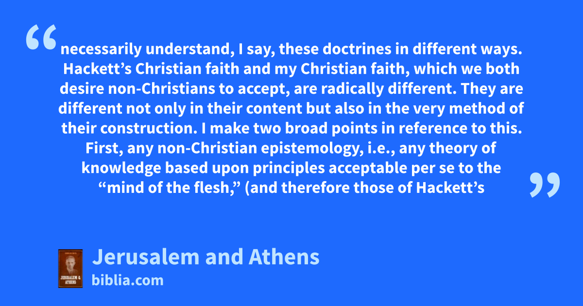 necessarily understand, I say, these doctrines in different ways. Hackett’s Christian faith and my Christian faith, which we both desire non-Christians to accept, are radically different. They are different not only in their content but also in the very method of their construction. I make two broad points in reference to this. First, any non-Christian epistemology, i.e., any theory of knowledge based upon principles acceptable per se to the “mind of the flesh,” (and therefore those of Hackett’s
