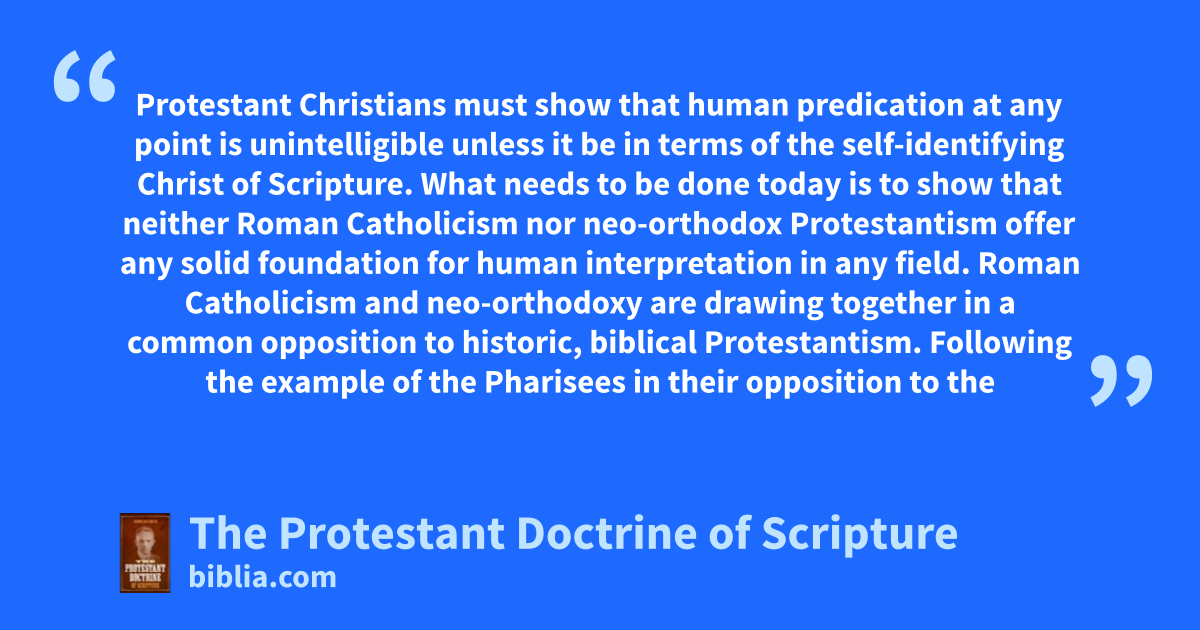 Protestant Christians must show that human predication at any point is unintelligible unless it be in terms of the self-identifying Christ of Scripture. What needs to be done today is to show that neither Roman Catholicism nor neo-orthodox Protestantism offer any solid foundation for human interpretation in any field. Roman Catholicism and neo-orthodoxy are drawing together in a common opposition to historic, biblical Protestantism. Following the example of the Pharisees in their opposition to the