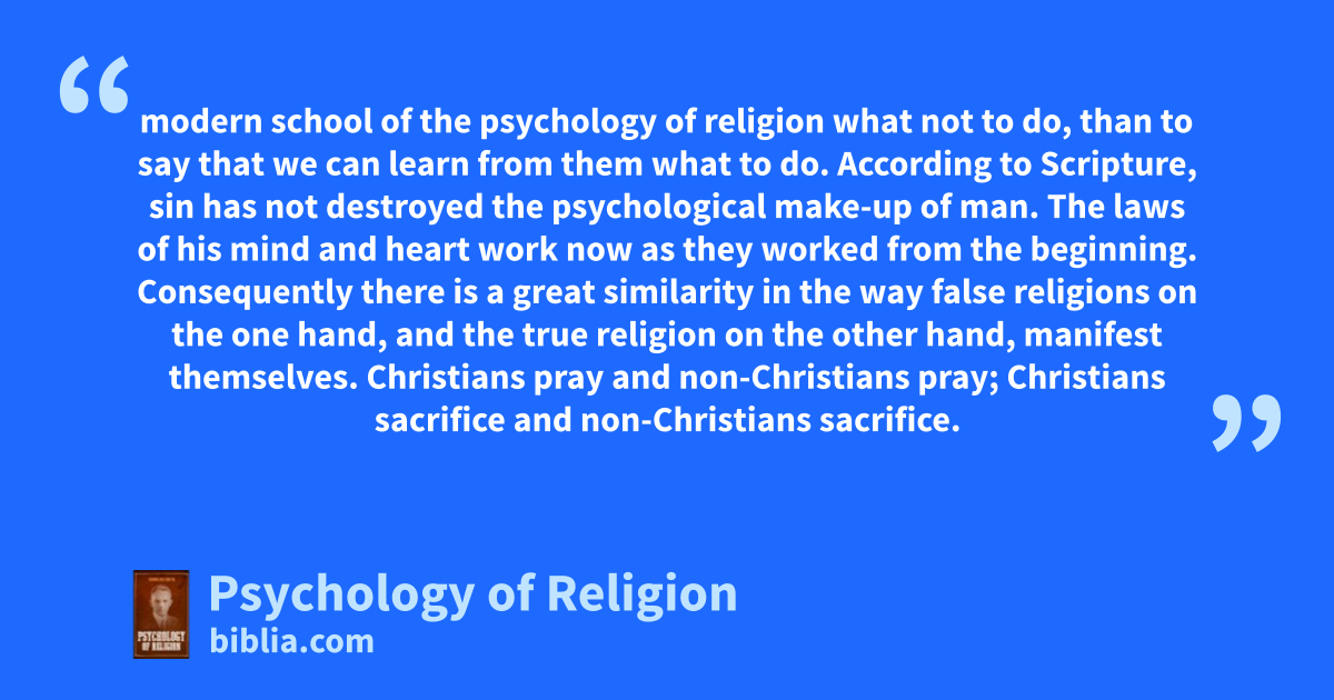 modern school of the psychology of religion what not to do, than to say that we can learn from them what to do. According to Scripture, sin has not destroyed the psychological make-up of man. The laws of his mind and heart work now as they worked from the beginning. Consequently there is a great similarity in the way false religions on the one hand, and the true religion on the other hand, manifest themselves. Christians pray and non-Christians pray; Christians sacrifice and non-Christians sacrifice.