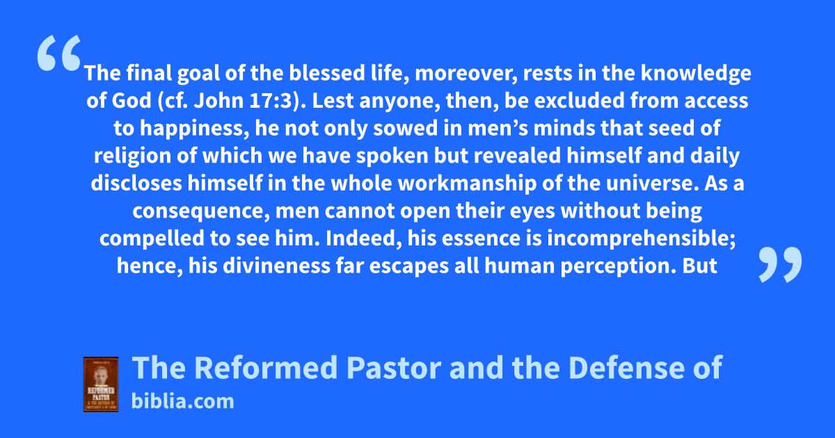 The final goal of the blessed life, moreover, rests in the knowledge of God (cf. John 17:3). Lest anyone, then, be excluded from access to happiness, he not only sowed in men’s minds that seed of religion of which we have spoken but revealed himself and daily discloses himself in the whole workmanship of the universe. As a consequence, men cannot open their eyes without being compelled to see him. Indeed, his essence is incomprehensible; hence, his divineness far escapes all human perception. But