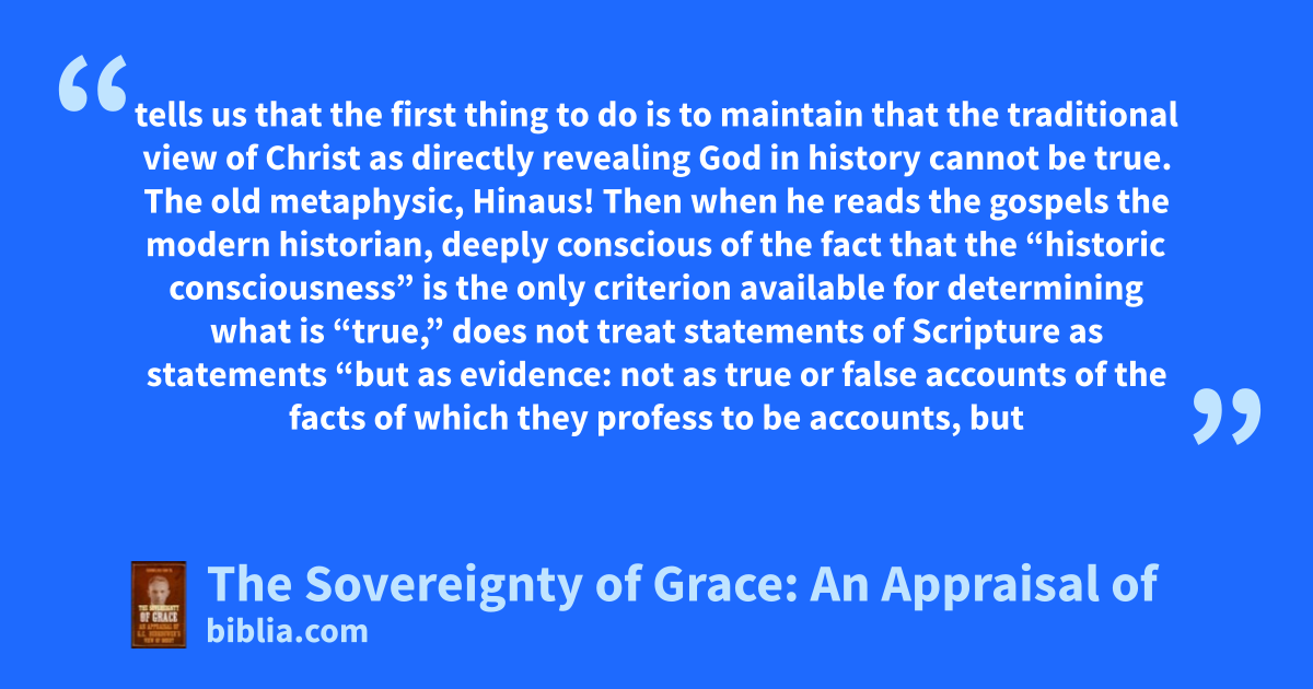 tells us that the first thing to do is to maintain that the traditional view of Christ as directly revealing God in history cannot be true. The old metaphysic, Hinaus! Then when he reads the gospels the modern historian, deeply conscious of the fact that the “historic consciousness” is the only criterion available for determining what is “true,” does not treat statements of Scripture as statements “but as evidence: not as true or false accounts of the facts of which they profess to be accounts, but