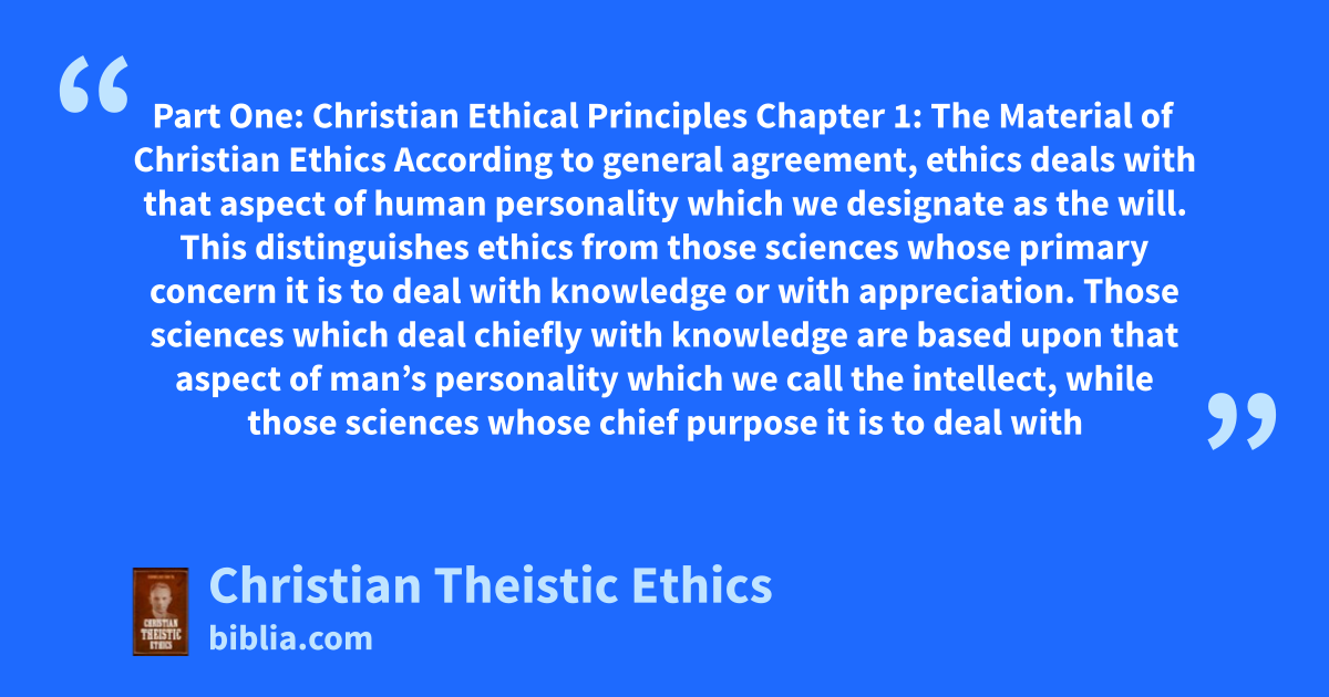 The Preface states, “This [book] claims with the historic Reformed creeds that the good is good because God in Christ through the Scriptures, says it is good. Without the presupposition of the self-sufficient moral consciousness of the triune God revealed in Scripture, man’s moral consciousness would operate in a vacuum. To bring out this point Part 1 deals with Christian Ethical Principles…Part...