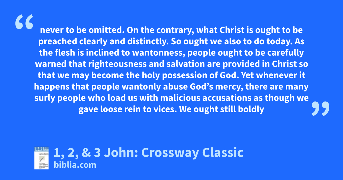 never to be omitted. On the contrary, what Christ is ought to be preached clearly and distinctly. So ought we also to do today. As the flesh is inclined to wantonness, people ought to be carefully warned that righteousness and salvation are provided in Christ so that we may become the holy possession of God. Yet whenever it happens that people wantonly abuse God’s mercy, there are many surly people who load us with malicious accusations as though we gave loose rein to vices. We ought still boldly