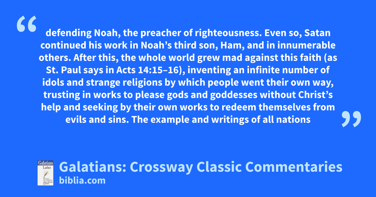 defending Noah, the preacher of righteousness. Even so, Satan continued his work in Noah’s third son, Ham, and in innumerable others. After this, the whole world grew mad against this faith (as St. Paul says in Acts 14:15–16), inventing an infinite number of idols and strange religions by which people went their own way, trusting in works to please gods and goddesses without Christ’s help and seeking by their own works to redeem themselves from evils and sins. The example and writings of all nations