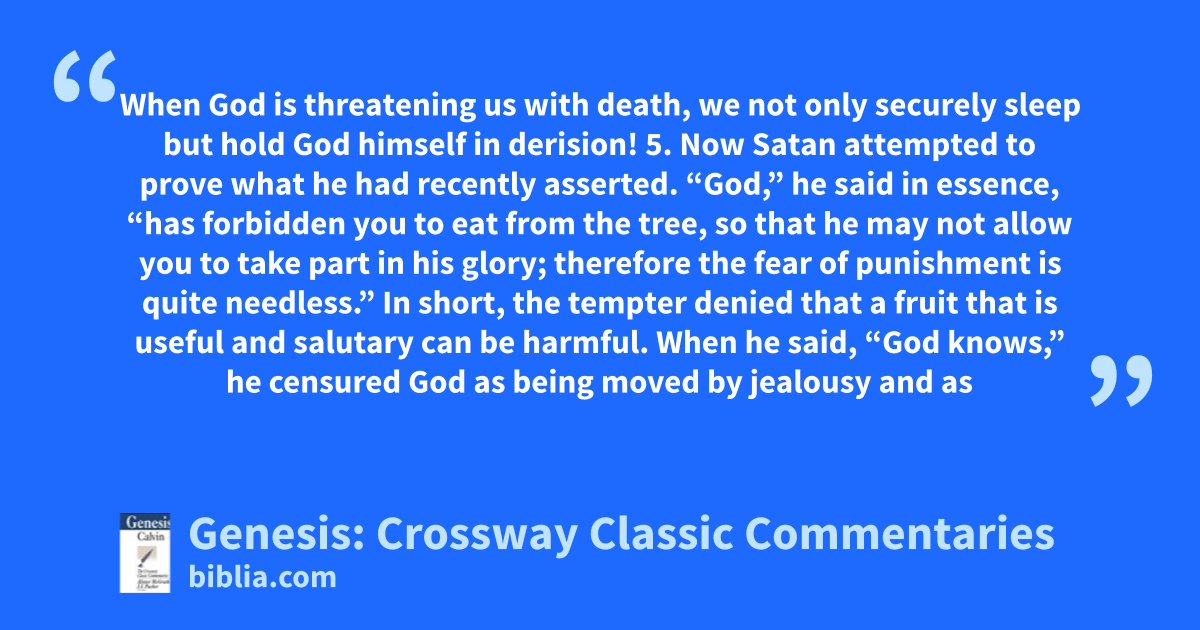 When God is threatening us with death, we not only securely sleep but hold God himself in derision! 5. Now Satan attempted to prove what he had recently asserted. “God,” he said in essence, “has forbidden you to eat from the tree, so that he may not allow you to take part in his glory; therefore the fear of punishment is quite needless.” In short, the tempter denied that a fruit that is useful and salutary can be harmful. When he said, “God knows,” he censured God as being moved by jealousy and as