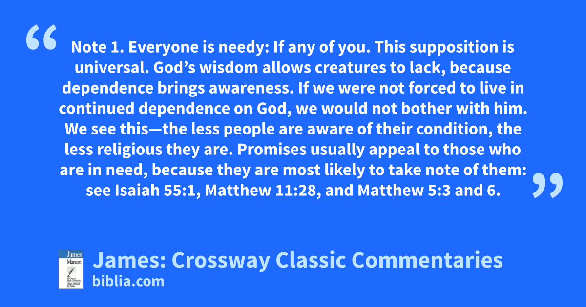 Note 1. Everyone is needy: If any of you. This supposition is universal. God’s wisdom allows creatures to lack, because dependence brings awareness. If we were not forced to live in continued dependence on God, we would not bother with him. We see this—the less people are aware of their condition, the less religious they are. Promises usually appeal to those who are in need, because they are most likely to take note of them: see Isaiah 55:1, Matthew 11:28, and Matthew 5:3 and 6.