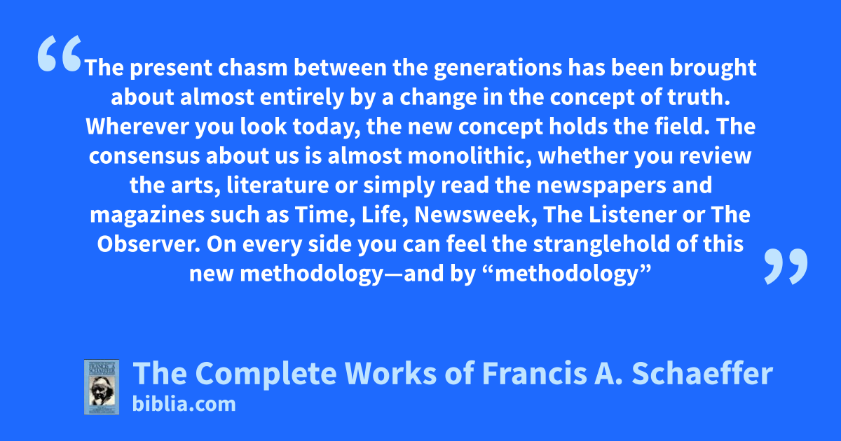 The present chasm between the generations has been brought about almost entirely by a change in the concept of truth. Wherever you look today, the new concept holds the field. The consensus about us is almost monolithic, whether you review the arts, literature or simply read the newspapers and magazines such as Time, Life, Newsweek, The Listener or The Observer. On every side you can feel the stranglehold of this new methodology—and by “methodology”