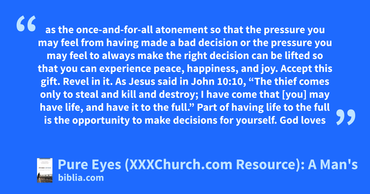 as the once-and-for-all atonement so that the pressure you may feel from having made a bad decision or the pressure you may feel to always make the right decision can be lifted so that you can experience peace, happiness, and joy. Accept this gift. Revel in it. As Jesus said in John 10:10, “The thief comes only to steal and kill and destroy; I have come that [you] may have life, and have it to the full.” Part of having life to the full is the opportunity to make decisions for yourself. God loves