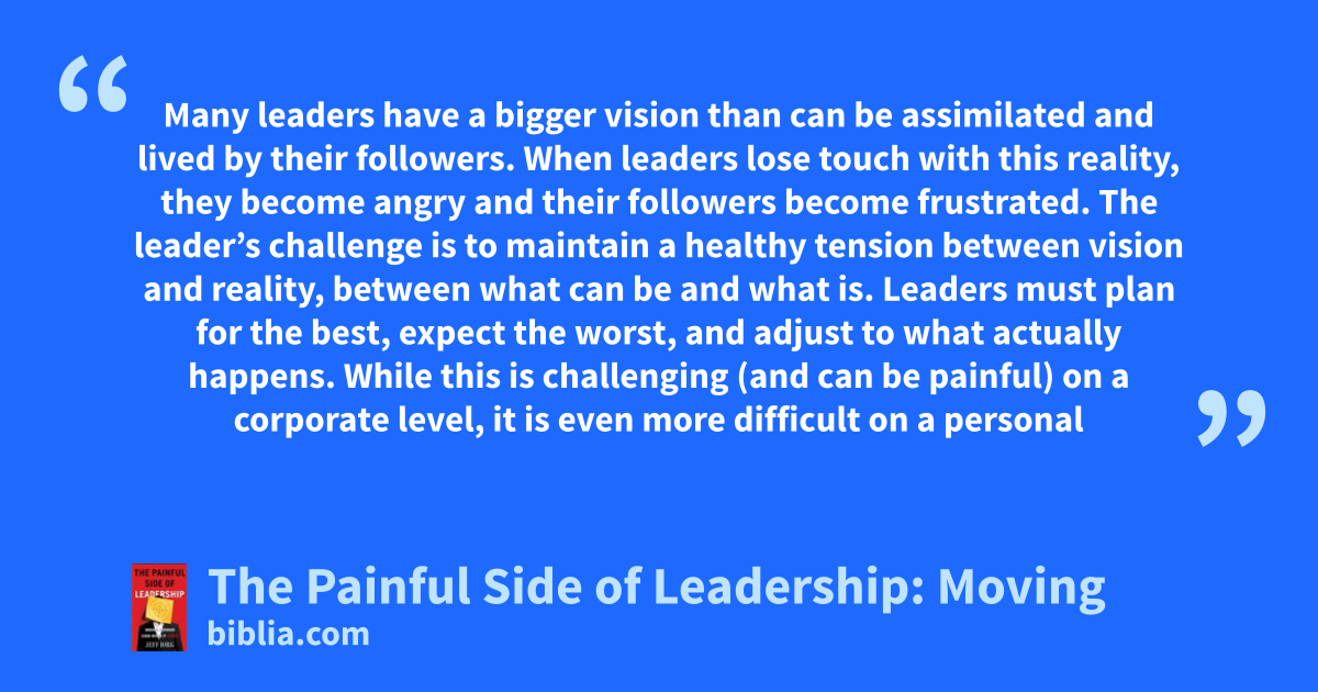 Many leaders have a bigger vision than can be assimilated and lived by their followers. When leaders lose touch with this reality, they become angry and their followers become frustrated. The leader’s challenge is to maintain a healthy tension between vision and reality, between what can be and what is. Leaders must plan for the best, expect the worst, and adjust to what actually happens. While this is challenging (and can be painful) on a corporate level, it is even more difficult on a personal
