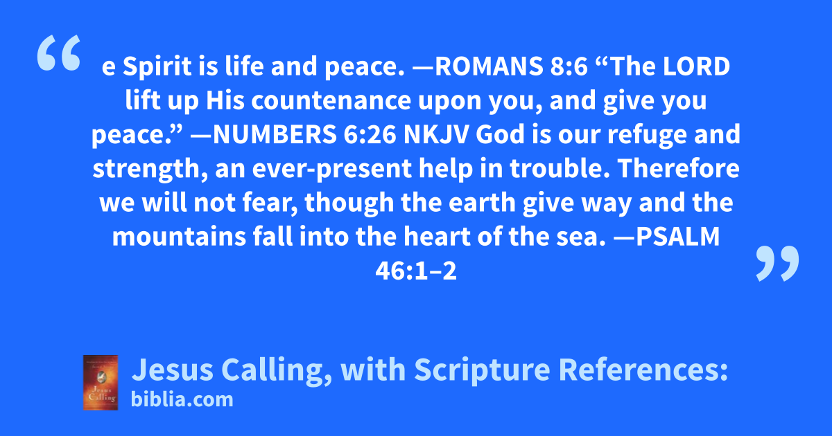 e Spirit is life and peace. —ROMANS 8:6 “The LORD lift up His countenance upon you, and give you peace.” —NUMBERS 6:26 NKJV God is our refuge and strength, an ever-present help in trouble. Therefore we will not fear, though the earth give way and the mountains fall into the heart of the sea. —PSALM 46:1–2