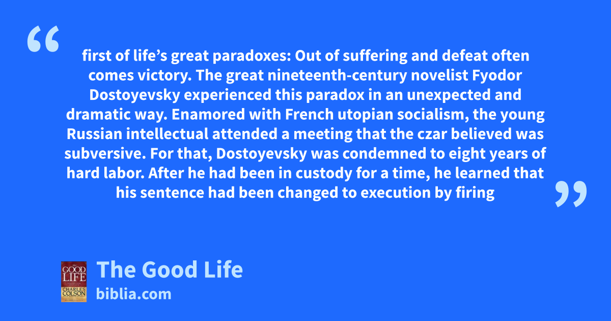 first of life’s great paradoxes: Out of suffering and defeat often comes victory. The great nineteenth-century novelist Fyodor Dostoyevsky experienced this paradox in an unexpected and dramatic way. Enamored with French utopian socialism, the young Russian intellectual attended a meeting that the czar believed was subversive. For that, Dostoyevsky was condemned to eight years of hard labor. After he had been in custody for a time, he learned that his sentence had been changed to execution by firing