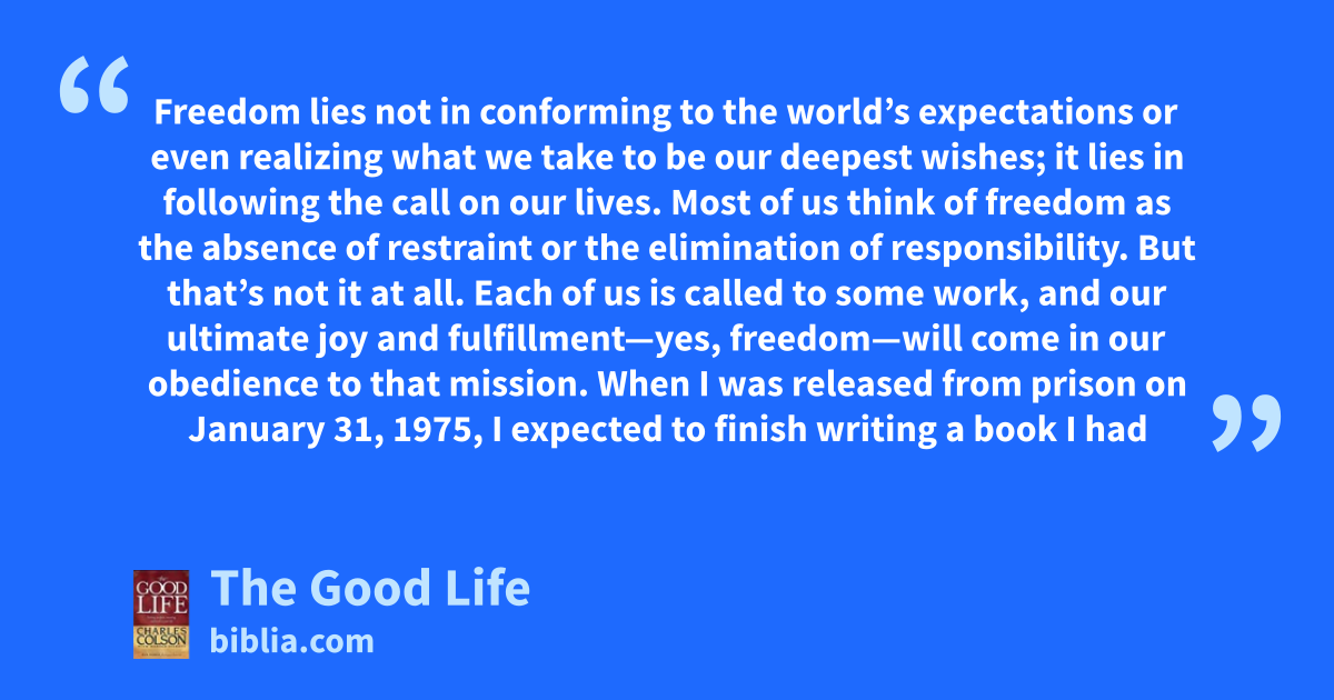 Freedom lies not in conforming to the world’s expectations or even realizing what we take to be our deepest wishes; it lies in following the call on our lives. Most of us think of freedom as the absence of restraint or the elimination of responsibility. But that’s not it at all. Each of us is called to some work, and our ultimate joy and fulfillment—yes, freedom—will come in our obedience to that mission. When I was released from prison on January 31, 1975, I expected to finish writing a book I had