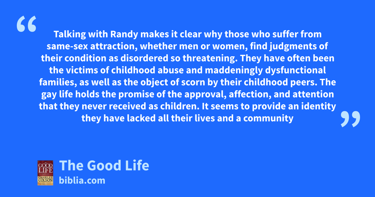 Talking with Randy makes it clear why those who suffer from same-sex attraction, whether men or women, find judgments of their condition as disordered so threatening. They have often been the victims of childhood abuse and maddeningly dysfunctional families, as well as the object of scorn by their childhood peers. The gay life holds the promise of the approval, affection, and attention that they never received as children. It seems to provide an identity they have lacked all their lives and a community