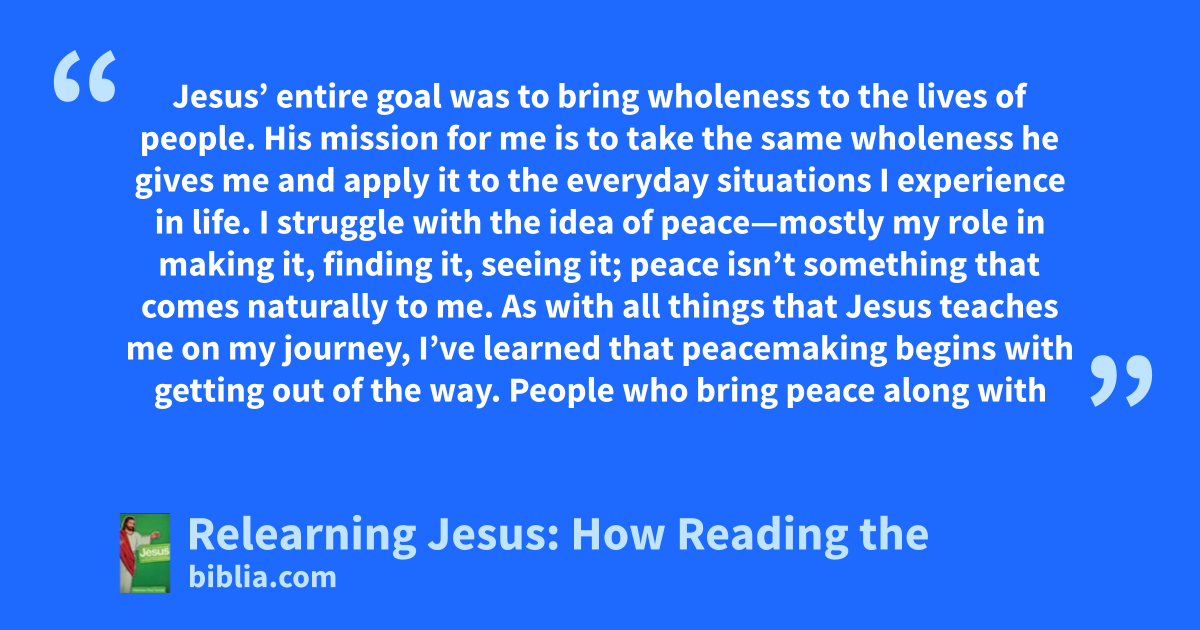 Jesus’ entire goal was to bring wholeness to the lives of people. His mission for me is to take the same wholeness he gives me and apply it to the everyday situations I experience in life. I struggle with the idea of peace—mostly my role in making it, finding it, seeing it; peace isn’t something that comes naturally to me. As with all things that Jesus teaches me on my journey, I’ve learned that peacemaking begins with getting out of the way. People who bring peace along with