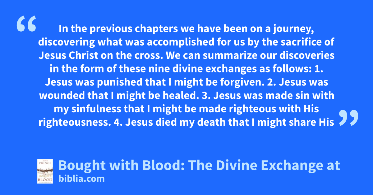 In the previous chapters we have been on a journey, discovering what was accomplished for us by the sacrifice of Jesus Christ on the cross. We can summarize our discoveries in the form of these nine divine exchanges as follows: 1. Jesus was punished that I might be forgiven. 2. Jesus was wounded that I might be healed. 3. Jesus was made sin with my sinfulness that I might be made righteous with His righteousness. 4. Jesus died my death that I might share His