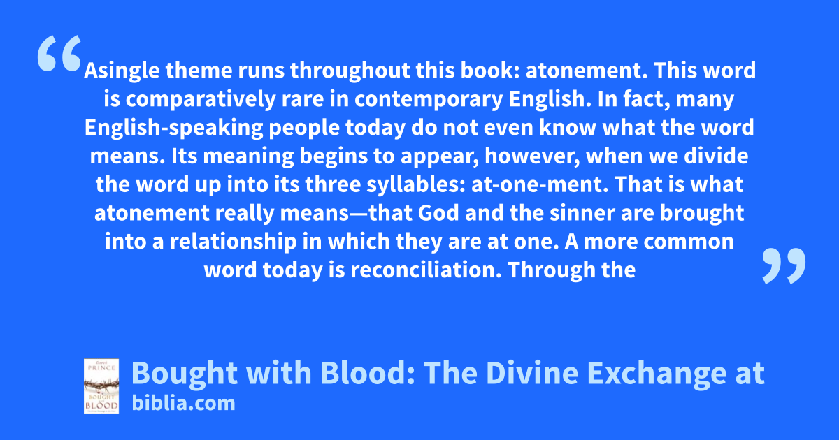 Asingle theme runs throughout this book: atonement. This word is comparatively rare in contemporary English. In fact, many English-speaking people today do not even know what the word means. Its meaning begins to appear, however, when we divide the word up into its three syllables: at-one-ment. That is what atonement really means—that God and the sinner are brought into a relationship in which they are at one. A more common word today is reconciliation. Through the