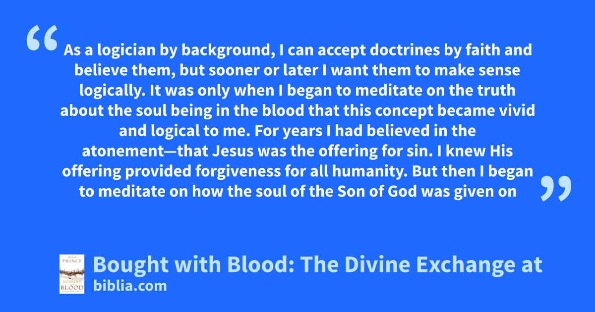As a logician by background, I can accept doctrines by faith and believe them, but sooner or later I want them to make sense logically. It was only when I began to meditate on the truth about the soul being in the blood that this concept became vivid and logical to me. For years I had believed in the atonement—that Jesus was the offering for sin. I knew His offering provided forgiveness for all humanity. But then I began to meditate on how the soul of the Son of God was given on