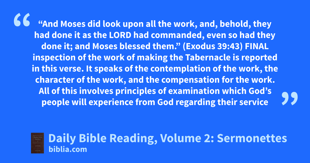 “And Moses did look upon all the work, and, behold, they had done it as the LORD had commanded, even so had they done it; and Moses blessed them.” (Exodus 39:43) FINAL inspection of the work of making the Tabernacle is reported in this verse. It speaks of the contemplation of the work, the character of the work, and the compensation for the work. All of this involves principles of examination which God’s people will experience from God regarding their service