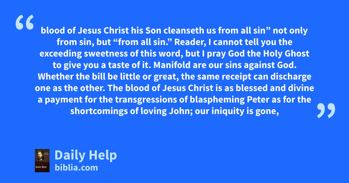 blood of Jesus Christ his Son cleanseth us from all sin” not only from sin, but “from all sin.” Reader, I cannot tell you the exceeding sweetness of this word, but I pray God the Holy Ghost to give you a taste of it. Manifold are our sins against God. Whether the bill be little or great, the same receipt can discharge one as the other. The blood of Jesus Christ is as blessed and divine a payment for the transgressions of blaspheming Peter as for the shortcomings of loving John; our iniquity is gone,