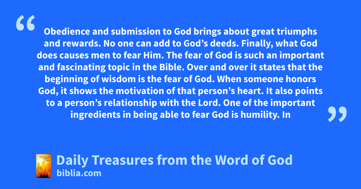 Obedience and submission to God brings about great triumphs and rewards. No one can add to God’s deeds. Finally, what God does causes men to fear Him. The fear of God is such an important and fascinating topic in the Bible. Over and over it states that the beginning of wisdom is the fear of God. When someone honors God, it shows the motivation of that person’s heart. It also points to a person’s relationship with the Lord. One of the important ingredients in being able to fear God is humility. In