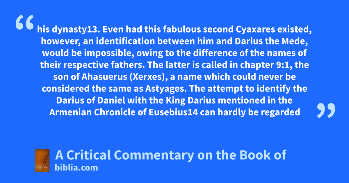 his dynasty13. Even had this fabulous second Cyaxares existed, however, an identification between him and Darius the Mede, would be impossible, owing to the difference of the names of their respective fathers. The latter is called in chapter 9:1, the son of Ahasuerus (Xerxes), a name which could never be considered the same as Astyages. The attempt to identify the Darius of Daniel with the King Darius mentioned in the Armenian Chronicle of Eusebius14 can hardly be regarded