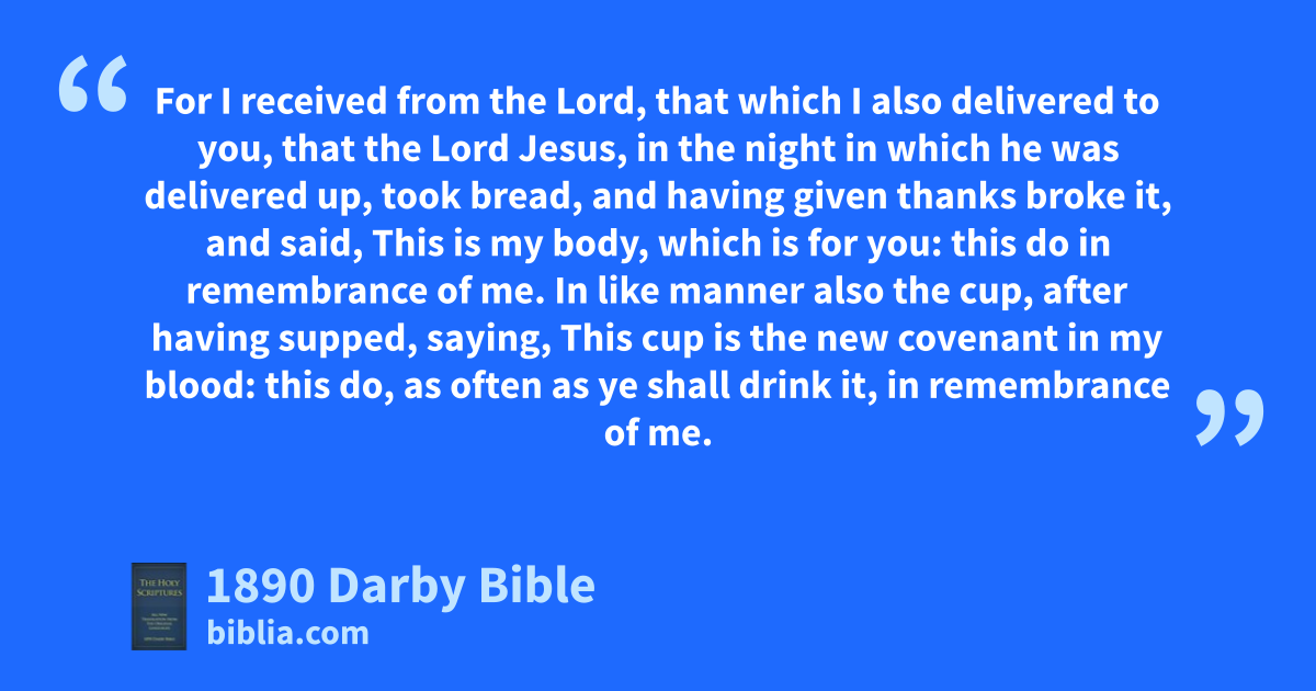 23 For I received from the Lord, that which I also delivered to you, that the Lord Jesus, in the night in which he was delivered up, took bread, 24 and having given thanks broke it, and said, This is my body, which is for you: this do in remembrance of me. 25 In like manner also the cup, after having supped, saying, This cup is the new covenant in my blood: this do, as often as ye shall drink it, in remembrance of me. 26 For as often as ye shall eat this bread, and drink the cup, ye announce the death of the Lord, until he come. 27 So that whosoever shall eat the bread, or drink the cup of the Lord, unworthily, shall be guilty in respect of the body and of the blood of the Lord. 28 But let a man prove himself, and thus eat of the bread, and drink of the cup. 29 For the eater and drinker eats and drinks judgment to himself, not distinguishing the body. 30 On this account many among you are weak and infirm, and a good many are fallen asleep. 31 But if we judged ourselves, so were we not judged. 32 But being judged, we are disciplined of the Lord, that we may not be condemned with the world. 33 So that, my brethren, when ye come together to eat, wait for one another. 34 If any one be hungry, let him eat at home, that ye may not come together for judgment. But the other things, whenever I come, I will set in order.