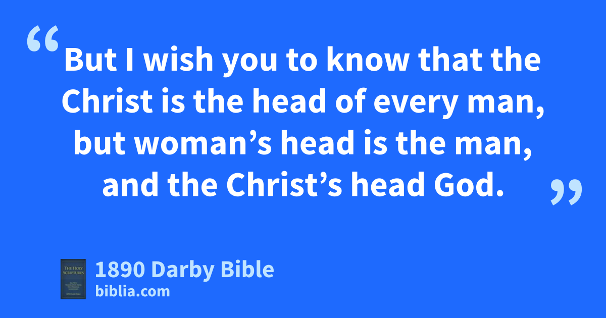 1 Be my imitators, even as I also am of Christ. 2 Now I praise you, that in all things ye are mindful of me; and that as I have directed you, ye keep the directions. 3 But I wish you to know that the Christ is the head of every man, but woman’s head is the man, and the Christ’s head God. 4 Every man praying or prophesying, having anything on his head, puts his head to shame. 5 But every woman praying or prophesying with her head uncovered puts her own head to shame; for it is one and the same as a shaved woman. 6 For if a woman be not covered, let her hair also be cut off. But if it be shameful to a woman to have her hair cut off or to be shaved, let her be covered. 7 For man indeed ought not to have his head covered, being God’s image and glory; but woman is man’s glory. 8 For man is not of woman, but woman of man. 9 For also man was not created for the sake of the woman, but woman for the sake of the man. 10 Therefore ought the woman to have authority on her head, on account of the angels. 11 However, neither is woman without man, nor man without woman, in the Lord. 12 For as the woman is of the man, so also is the man by the woman, but all things of God. 13 Judge in yourselves: is it comely that a woman should pray to God uncovered? 14 Does not even nature itself teach you, that man, if he have long hair, it is a dishonour to him? 15 But woman, if she have long hair, it is glory to her; for the long hair is given to her in lieu of a veil. 16 But if any one think to be contentious, we have no such custom, nor the assemblies of God.