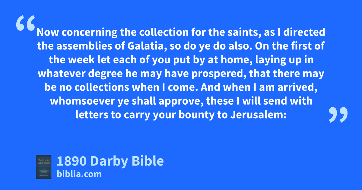 1 Now concerning the collection for the saints, as I directed the assemblies of Galatia, so do ye do also. 2 On the first of the week let each of you put by at home, laying up in whatever degree he may have prospered, that there may be no collections when I come. 3 And when I am arrived, whomsoever ye shall approve, these I will send with letters to carry your bounty to Jerusalem: 4 and if it be suitable that I also should go, they shall go with me.