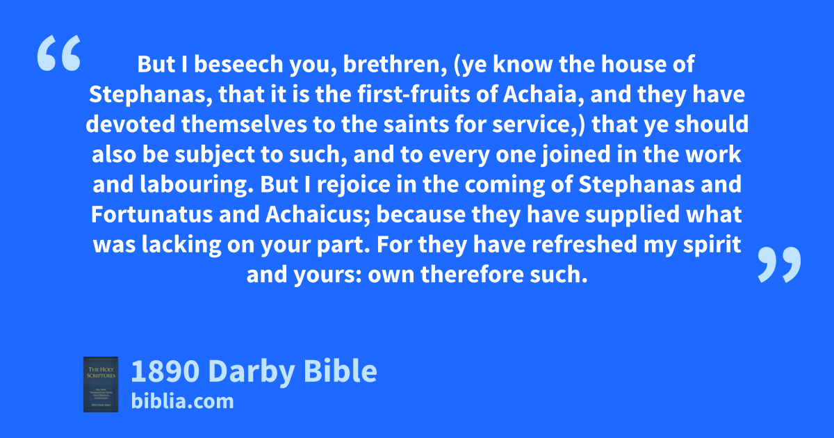 13 Be vigilant; stand fast in the faith; quit yourselves like men; be strong. 14 Let all things ye do be done in love. 15 But I beseech you, brethren, (ye know the house of Stephanas, that it is the first-fruits of Achaia, and they have devoted themselves to the saints for service,) 16 that ye should also be subject to such, and to every one joined in the work and labouring. 17 But I rejoice in the coming of Stephanas and Fortunatus and Achaicus; because they have supplied what was lacking on your part. 18 For they have refreshed my spirit and yours: own therefore such.