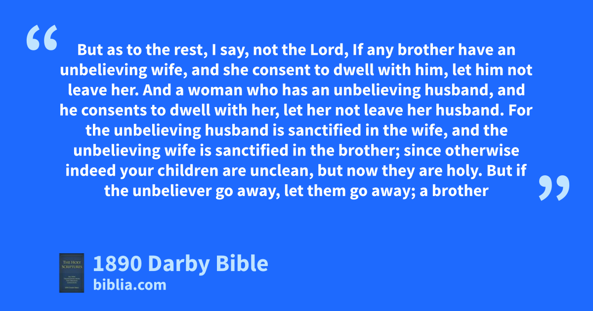 10 But to the married I enjoin, not I, but the Lord, Let not wife be separated from husband; 11 (but if also she shall have been separated, let her remain unmarried, or be reconciled to her husband;) and let not husband leave wife. 12 But as to the rest, I say, not the Lord, If any brother have an unbelieving wife, and she consent to dwell with him, let him not leave her. 13 And a woman who has an unbelieving husband, and he consents to dwell with her, let her not leave her husband. 14 For the unbelieving husband is sanctified in the wife, and the unbelieving wife is sanctified in the brother; since otherwise indeed your children are unclean, but now they are holy. 15 But if the unbeliever go away, let them go away; a brother or a sister is not bound in such cases, but God has called us in peace. 16 For what knowest thou, O wife, if thou shalt save thy husband? or what knowest thou, O husband, if thou shalt save thy wife?