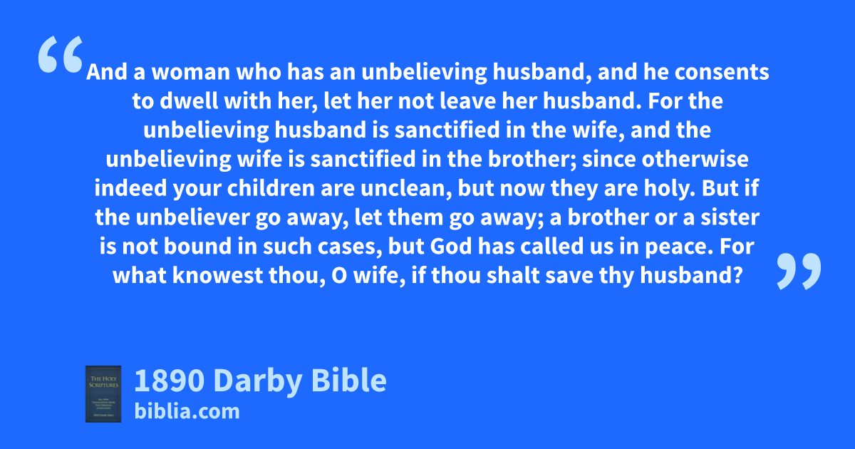 10 But to the married I enjoin, not I, but the Lord, Let not wife be separated from husband; 11 (but if also she shall have been separated, let her remain unmarried, or be reconciled to her husband;) and let not husband leave wife. 12 But as to the rest, I say, not the Lord, If any brother have an unbelieving wife, and she consent to dwell with him, let him not leave her. 13 And a woman who has an unbelieving husband, and he consents to dwell with her, let her not leave her husband. 14 For the unbelieving husband is sanctified in the wife, and the unbelieving wife is sanctified in the brother; since otherwise indeed your children are unclean, but now they are holy. 15 But if the unbeliever go away, let them go away; a brother or a sister is not bound in such cases, but God has called us in peace. 16 For what knowest thou, O wife, if thou shalt save thy husband? or what knowest thou, O husband, if thou shalt save thy wife?