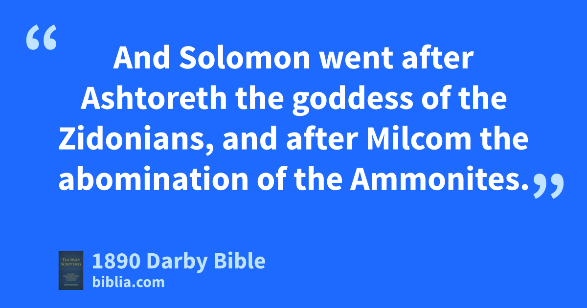 1 But king Solomon loved many foreign women, besides the daughter of Pharaoh: women of the Moabites, Ammonites, Edomites, Zidonians, Hittites; 2 of the nations of which Jehovah had said to the children of Israel, Ye shall not go in to them, neither shall they come in to you; they would certainly turn away your heart after their gods: to these Solomon was attached in love. 3 And he had seven hundred wives, princesses, and three hundred concubines; and his wives turned away his heart. 4 And it came to pass when Solomon was old, that his wives turned away his heart after other gods; and his heart was not perfect with Jehovah his God, as the heart of David his father. 5 And Solomon went after Ashtoreth the goddess of the Zidonians, and after Milcom the abomination of the Ammonites. 6 And Solomon did evil in the sight of Jehovah, and followed not fully Jehovah, as David his father. 7 Then did Solomon build a high place for Chemosh the abomination of the Moabites, on the hill that is before Jerusalem, and for Molech the abomination of the children of Ammon. 8 And so he did for all his foreign wives, who burned incense and sacrificed to their gods.
