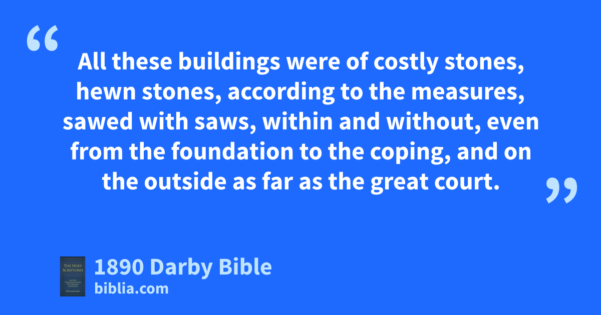1 And Solomon was thirteen years building his own house; and he finished all his house. 2 And he built the house of the forest of Lebanon; its length was a hundred cubits, and its breadth fifty cubits, and its height thirty cubits, upon four rows of cedar-pillars, with cedar-beams upon the pillars; 3 and it was covered with cedar above upon the side-chambers, which were on forty-five pillars, fifteen in a row. 4 And there were cross-beams in three rows, and window was against window in three ranks. 5 And all the doors and posts were square, with an architrave; and window was against window in three ranks. 6 And he made the porch of pillars; its length was fifty cubits, and its breadth thirty cubits; and there was a porch in front of them; and there were pillars, and steps in front of them. 7 And he made the porch for the throne where he judged, the porch of judgment; and it was covered with cedar from floor to floor. 8 And his house where he dwelt had another court within the porch, which was of the like work. And he made, like to this porch, a house for Pharaoh’s daughter, whom Solomon had taken. 9 All these buildings were of costly stones, hewn stones, according to the measures, sawed with saws, within and without, even from the foundation to the coping, and on the outside as far as the great court. 10 And the foundations were of costly stones, great stones, stones of ten cubits and stones of eight cubits. 11 And above were costly stones, hewn stones, according to the measures, and cedar. 12 And the great court round about had three rows of hewn stones, and a row of cedar-beams; and so it was for the inner court of the house of Jehovah, and the porch of the house.