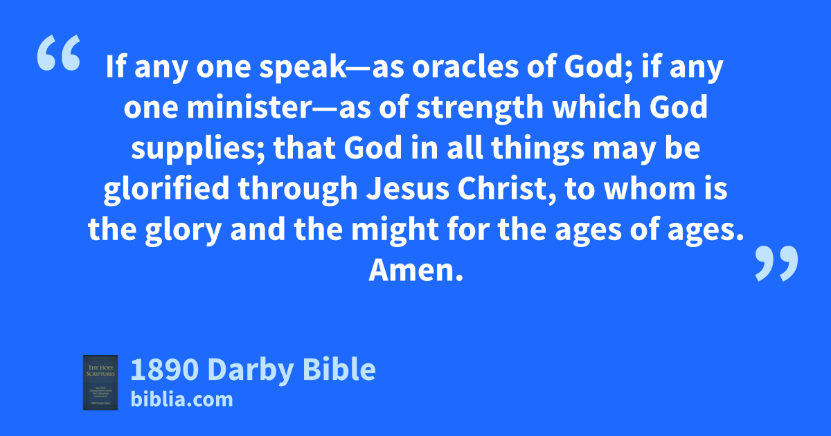 7 But the end of all things is drawn nigh: be sober therefore, and be watchful unto prayers; 8 but before all things having fervent love among yourselves, because love covers a multitude of sins; 9 hospitable one to another, without murmuring; 10 each according as he has received a gift, ministering it to one another, as good stewards of the various grace of God. 11 If any one speak—as oracles of God; if any one minister—as of strength which God supplies; that God in all things may be glorified through Jesus Christ, to whom is the glory and the might for the ages of ages. Amen.