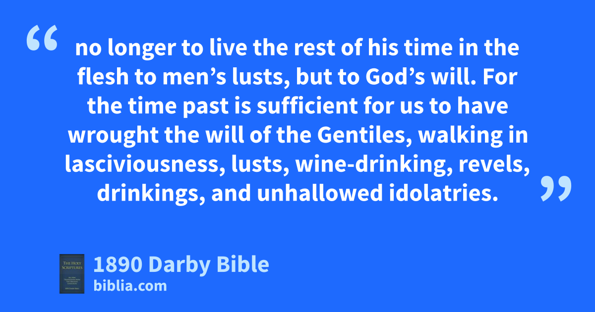 1 Christ, then, having suffered for us in the flesh, do ye also arm yourselves with the same mind; for he that has suffered in the flesh has done with sin, 2 no longer to live the rest of his time in the flesh to men’s lusts, but to God’s will. 3 For the time past is sufficient for us to have wrought the will of the Gentiles, walking in lasciviousness, lusts, wine-drinking, revels, drinkings, and unhallowed idolatries.
