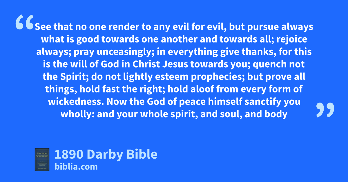 16 rejoice always; 17 pray unceasingly; 18 in everything give thanks, for this is the will of God in Christ Jesus towards you; 19 quench not the Spirit; 20 do not lightly esteem prophecies; 21 but prove all things, hold fast the right; 22 hold aloof from every form of wickedness.