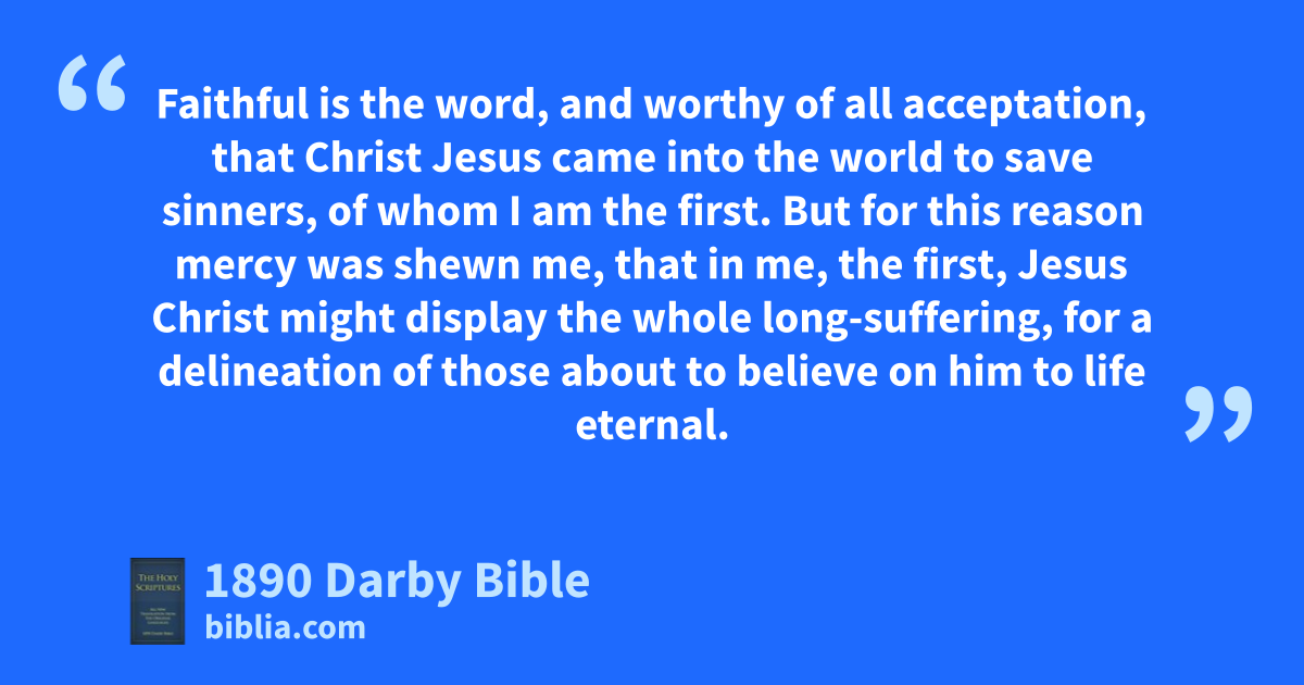 12 And I thank Christ Jesus our Lord, who has given me power, that he has counted me faithful, appointing to ministry him 13 who before was a blasphemer and persecutor, and an insolent overbearing man: but mercy was shewn me because I did it ignorantly, in unbelief. 14 But the grace of our Lord surpassingly over-abounded with faith and love, which is in Christ Jesus. 15 Faithful is the word, and worthy of all acceptation, that Christ Jesus came into the world to save sinners, of whom I am the first. 16 But for this reason mercy was shewn me, that in me, the first, Jesus Christ might display the whole long-suffering, for a delineation of those about to believe on him to life eternal. 17 Now to the King of the ages, the incorruptible, invisible, only God, honour and glory to the ages of ages. Amen.