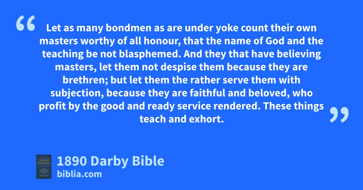 1 Let as many bondmen as are under yoke count their own masters worthy of all honour, that the name of God and the teaching be not blasphemed. 2 And they that have believing masters, let them not despise them because they are brethren; but let them the rather serve them with subjection, because they are faithful and beloved, who profit by the good and ready service rendered. These things teach and exhort. 3 If any one teach differently, and do not accede to sound words, those of our Lord Jesus Christ, and the teaching which is according to piety, 4 he is puffed up, knowing nothing, but sick about questions and disputes of words, out of which arise envy, strife, injurious words, evil suspicions, 5 constant quarrellings of men corrupted in mind and destitute of the truth, holding gain to be the end of piety.