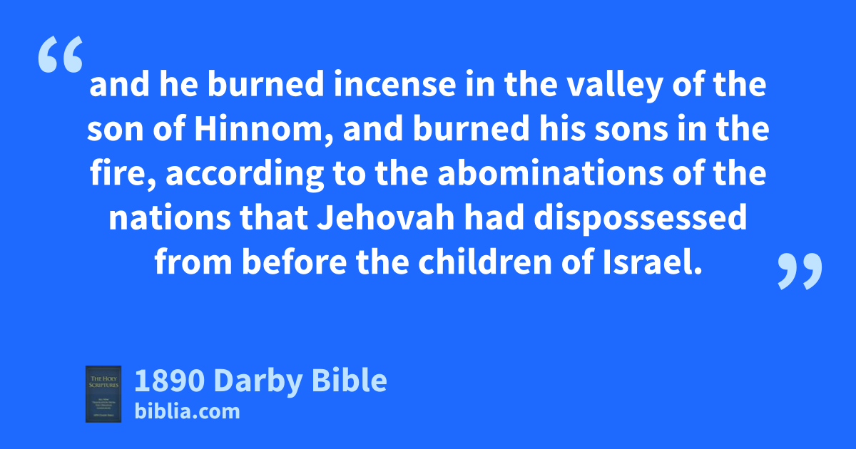 1 Ahaz was twenty years old when he began to reign; and he reigned sixteen years in Jerusalem. And he did not what was right in the sight of Jehovah, like David his father, 2 but walked in the ways of the kings of Israel, and even made molten images for the Baals; 3 and he burned incense in the valley of the son of Hinnom, and burned his sons in the fire, according to the abominations of the nations that Jehovah had dispossessed from before the children of Israel. 4 And he sacrificed and burned incense on the high places, and on the hills, and under every green tree. 5 Therefore Jehovah his God gave him into the hand of the king of Syria; and they smote him, and carried away a great multitude of them captives, and brought them to Damascus. And he was also given into the hand of the king of Israel, who smote him with a great slaughter.
