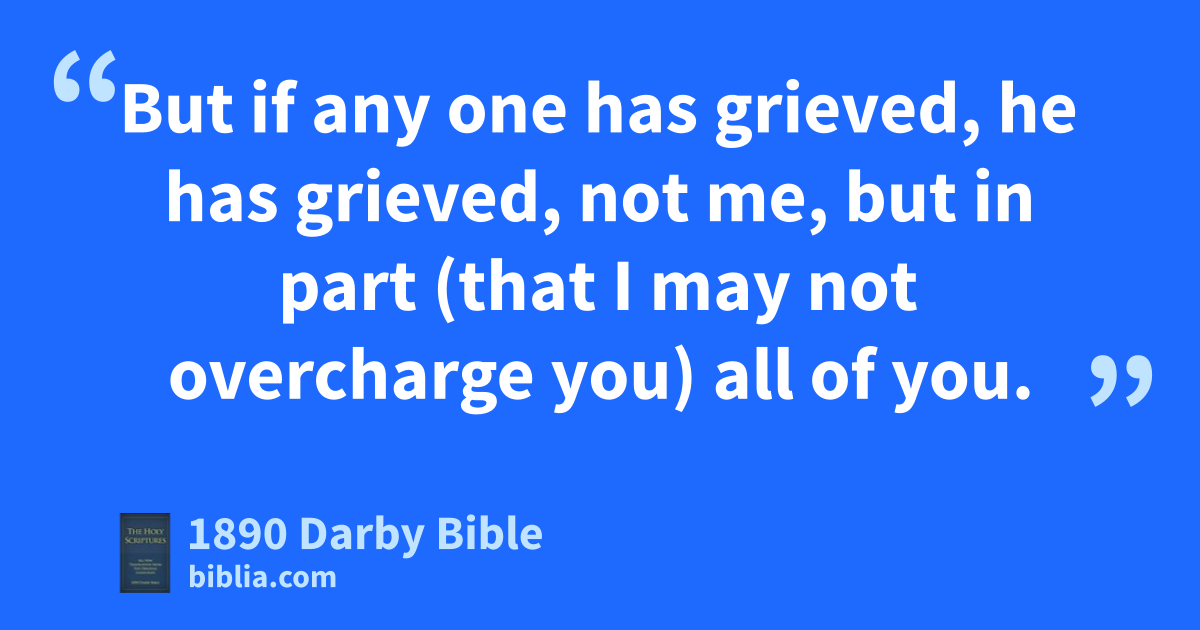 5 But if any one has grieved, he has grieved, not me, but in part (that I may not overcharge you) all of you. 6 Sufficient to such a one is this rebuke which has been inflicted by the many; 7 so that on the contrary ye should rather shew grace and encourage, lest perhaps such a one should be swallowed up with excessive grief. 8 Wherefore I exhort you to assure him of your love. 9 For to this end also I have written, that I might know, by putting you to the test, if as to everything ye are obedient. 10 But to whom ye forgive anything, I also; for I also, what I have forgiven, if I have forgiven anything, it is for your sakes in the person of Christ; 11 that we might not have Satan get an advantage against us, for we are not ignorant of his thoughts.